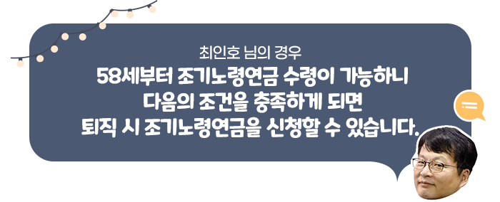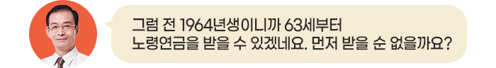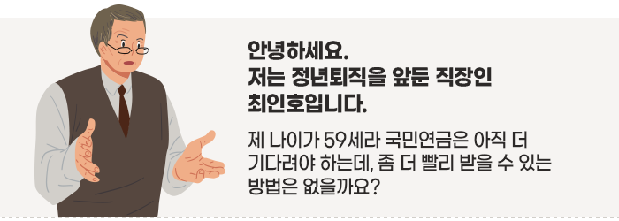 안녕하세요. 저는 정년퇴직을 앞둔 직장인 최인호입니다. 퇴직이 눈앞이다 보니 이래저래 걱정이 많습니다. 당장 퇴직하고 다달이 나오던 월급이 사라지면 어떻게 살아야할지 막막합니다. 국민연금은 아직 3년 더 기다려야 받을 수 있는데 말입니다. 국민연금을 좀 더 빨리 받을 수는 없을까요?