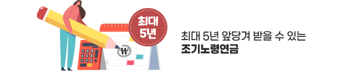 노령연금은 수급 개시 연령을 기준으로 해서 최장 5년 앞당겨 받을 수도 있고, 뒤로 5년 늦춰 받을 수도 있습니다. 이렇게 노령연금을 앞당겨 받는 것을 ‘조기노령연금’이라고 합니다.