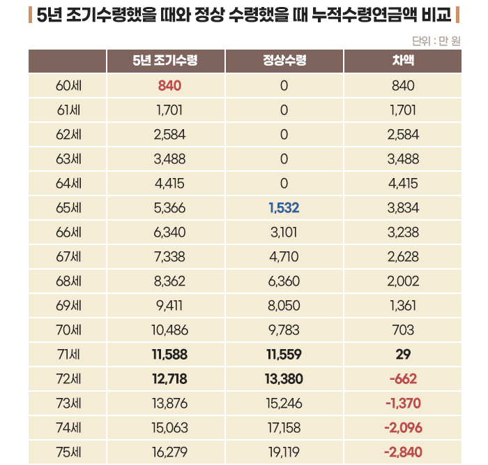 아래 표는 K씨가 60세부터 조기노령연금을 받았을 때와 65세부터 정상적으로 수령했을 때의 누적연금액을 비교한 것입니다. 표에서 보듯이 60세부터 71세에 이를 때까지 5년 앞당겨 수령했을 때 누적연금수령액이 많습니다.