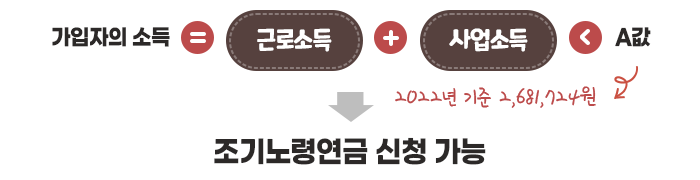 이때 가입자의 소득은 근로소득과 사업소득을 합산한 금액을 말합니다. 그리고 ‘A값’은 국민연금 전체 가입자의 최근 3년간 평균소득월액을 평균한 값인데, 2022년에 적용하는 ‘A값’은 2,681,724원입니다. 가입자의 근로소득과 사업소득을 합산한 금액이 ‘A값’보다 적어야 조기노령연금을 신청할 수 있습니다.