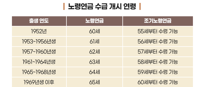 1952년 이전 출생자는 60세부터, 1953년부터 1956년 사이 출생자는 61세, 1957년부터 1960년 사이 출생자는 62세, 1961년부터 1964년 사이 출생자는 63세, 1965년부터 1968년 사이 출생자는 64세, 1969년 이후 출생자는 65세부터 연금을 수령할 수 있습니다.