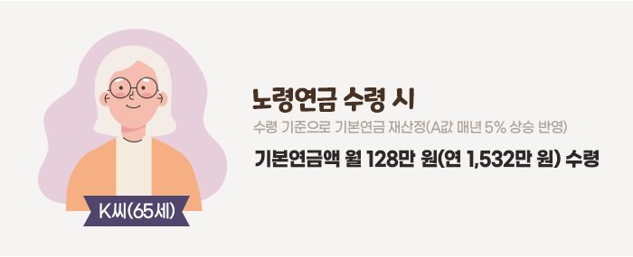 앞서 국민연금 전체 가입자의 소득(A값)이 매년 5% 상승한다고 했는데, 이를 반영하면 K씨는 65세에 기본연금으로 매달 128만 원(연간 1,532만 원)을 수령하게 됩니다. 그리고 이듬해부터는 물가변동에 맞춰 연금액이 조정됩니다.