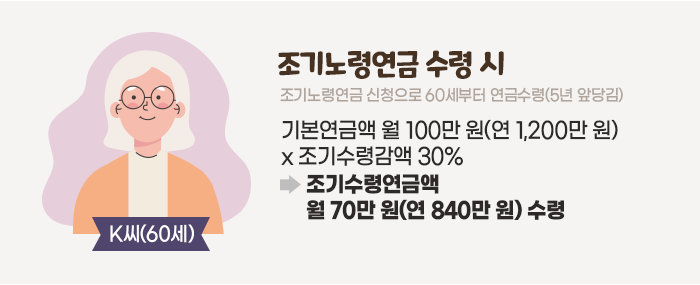 올해 예순 살인 K씨를 예로 들어보겠습니다. 먼저 조기노령연금을 신청해서 5년 빨리 연금을 받았을 때부터 살펴보겠습니다.
