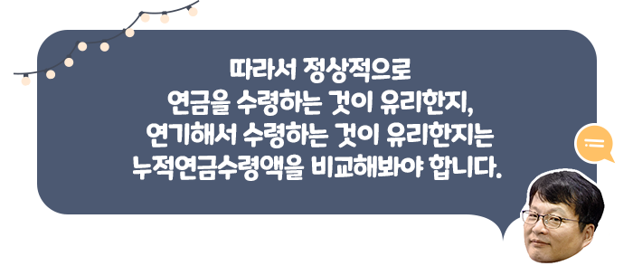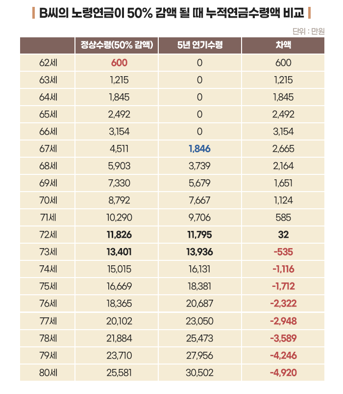 앞서 B씨가 소득이 있는 업무에 종사해서 정상적으로 연금을 수령하면 연금액이 50% 감액된다고 해보겠습니다. 이 경우 B씨가 연금 수급 시기를 5년 뒤로 연기하면, 손익분기점은 73세로 앞당겨집니다.