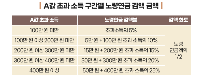 이렇게 해서 최대 본인 노령연금 수령액의 절반까지 감액될 수 있습니다.
