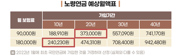 아래 표는 2022년 1월에 국민연금에 가입한 사람의 보험료와 가입기간에 따라 받는 노령연금월액을 나타낸 것입니다. 매달 9만 원씩 20년 동안 보험료를 낸 사람은 노령연금으로 매달 373,000원을 받지만, 18만 원씩 10년간 보험료를 납부한 사람은 매달 240,230원을 연금으로 수령하게 됩니다.