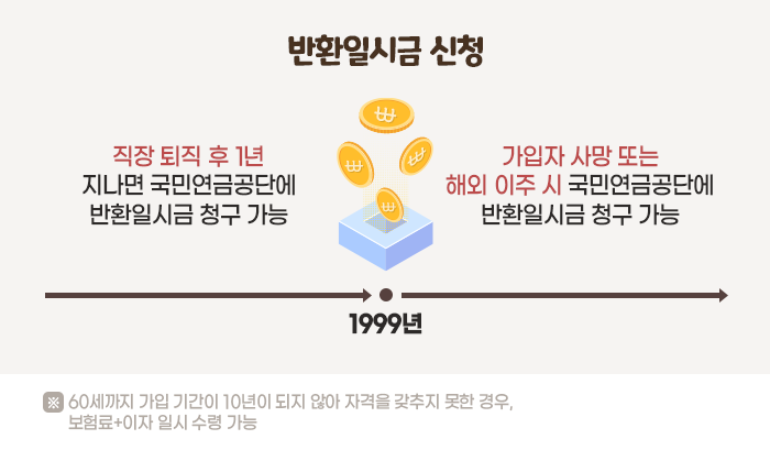 그렇지만, 1999년 이전에는 사정이 달랐습니다. 당시에는 굳이 60세가 될 때까지 기다리지 않아도 직장에서 퇴직하고 1년만 지나면 국민연금공단에 반환일시금을 청구해서 받을 수 있었습니다.