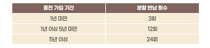 종전에 납부했던 기간이 1년 미만이면 3회, 2년 이상 5년 미만이면 12회, 5년 이상이면 24회에 걸쳐 분할납부 할 수 있습니다.