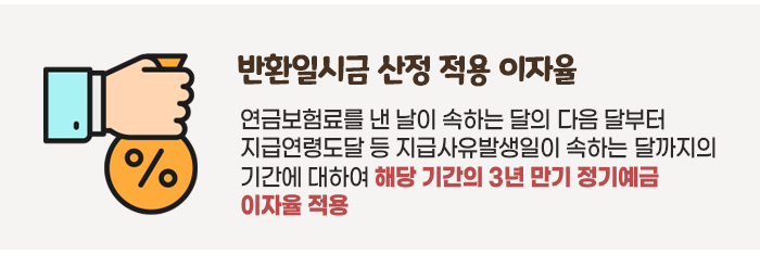 반환일시금을 반납할 때 이자는 반환일시금을 받은 날이 속하는 달부터 반납을 하는 날이 속하는 달의 전달까지 1년 만기 정기예금 이자율을 적용해서 계산합니다.