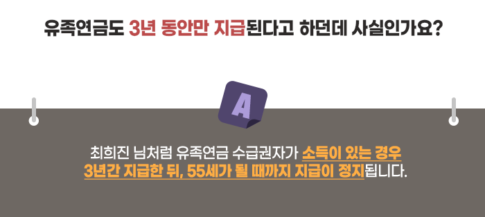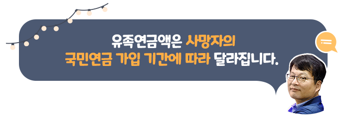 남편이 20년 이상 보험료를 납입했고, 19세 미만인 딸이 있으므로 최희진 씨는 남편 기본연금액의 60%에 부양가족연금을 더해 유족연금을 수령할 수 있습니다.