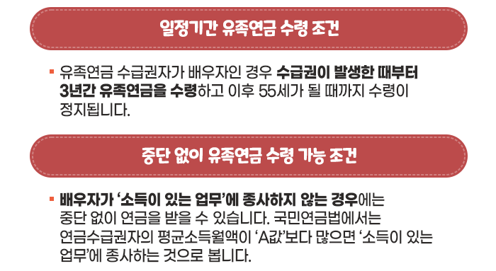 이밖에 배우자가 장애등급 2급 이상이거나, 사망자의 25세 미만인 자녀 또는 장애등급 2급 이상인 자녀를 돌봐야 할 때도 유족연금을 중단 없이 수령할 수 있습니다.
