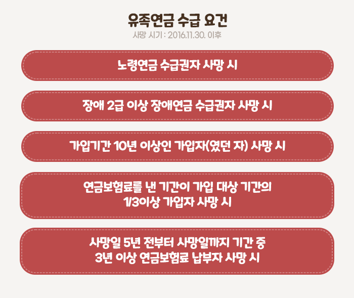 다만 유족연금을 받으려면 일정한 수급요건을 갖춰야 합니다. 유족연금 수급 요건은 사망 시기에 따라 다른데, 사망한 날이 2016년 11월 30일 이후인 경우 유족연금 수급 요건은 다음과 같습니다.