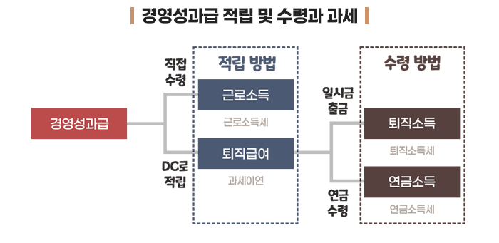 아래 그림은 경영성과급을 적립하는 방법과 수령 방법 및 부담하는 세금의 종류를 정리한 것입니다. 참고하셔서 잘 활용하시기 바랍니다.