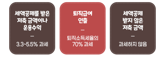 인출한 금액이 가입자가 세액공제를 받고 저축한 금액이거나 운용수익이면, 3.3~5.5%의 세율로 과세하고, 퇴직급여를 인출하는 경우에는 퇴직소득세율의 70%에 해당하는 세율로 과세합니다. 단, 가입자가 세액공제 받지 않고 저축한 금액을 인출할 때는 과세하지 않습니다.