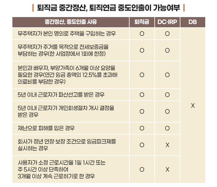 단, 퇴직급여 종류에 따라 중간정산 또는 중도인출