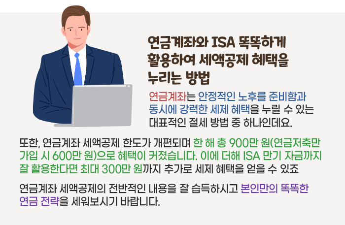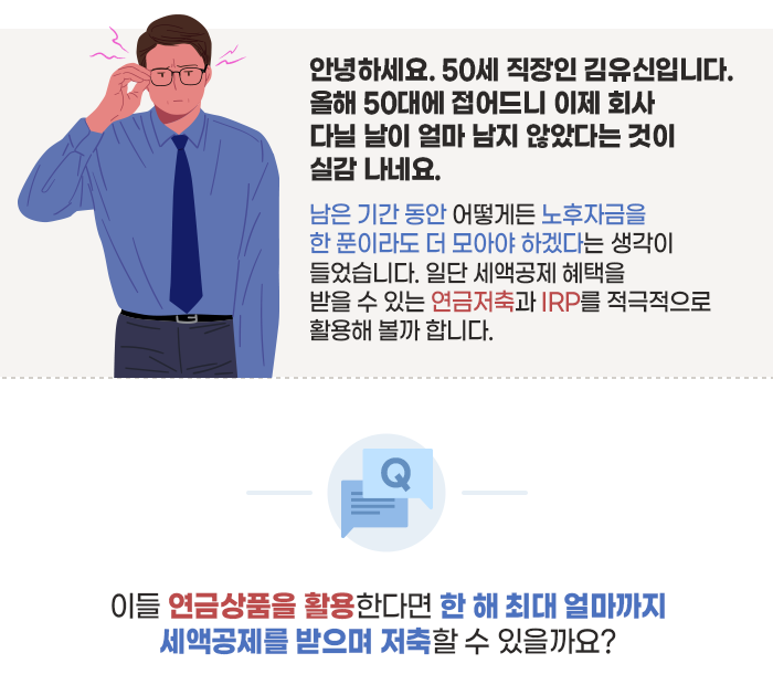 잘 생각하셨습니다. 정년이 10년 정도 남았지만, 연금계좌를 활용해 세액공제를 받으면 더 효과적으로 노후 생활 자금을 모으실 수 있습니다.
