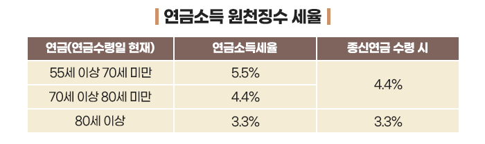 연금 수령 당시 나이가 55세 이상 69세 이하면 5.5%, 70세 이상 79세 이하면 4.4%, 80세 이상이면 3.3% 세율로 연금소득세를 원천징수 합니다. 종신형 연금을 선택한 경우에는 55세부터 69세 사이에도 4.4% 세율을 적용합니다.