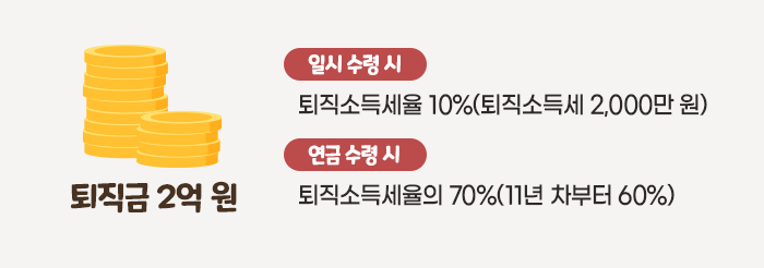 예를 들어, 오연주 씨가 퇴직하면서 퇴직급여 2억 원을 일시에 수령하면 퇴직소득세로 2,000만 원을 납부해야 한다고 가정해 보겠습니다. 이 경우 퇴직소득세율은 10%(=2,000만 원/2억 원)가 됩니다. 따라서 퇴직급여를 연금으로 수령할 때는 연금수령액의 7%(11년 차부터는 6%)를 세금으로 납부하게 됩니다.