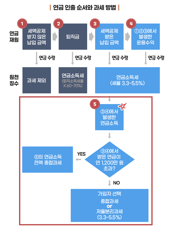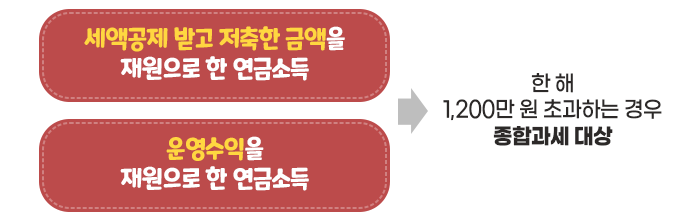 하지만 세액공제 받고 저축한 금액과 운용수익을 재원으로 연금소득이 한 해 1,200만 원을 초과하는 경우 해당 연금소득을 다른 소득과 합산해 종합과세합니다.