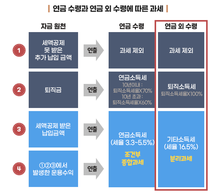 세액공제를 받고 저축한 금액과 운용수익을 ‘연금 외 수령’하는 경우에는 기타소득(16.5%)으로 보고 분리과세 합니다.