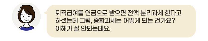 퇴직급여를 재원으로 한 연금소득 또한 다른 소득과 합산하지 않고 분리과세 합니다. 따라서 이 역시 다른 소득과 합산해서 과세 될 우려가 없습니다.