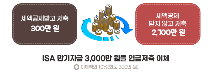 ISA 만기 자금도 연금계좌에 이체해서 세액공제를 받을 수 있죠. ISA 만기 자금을 연금계좌에 이체하면 이체금액의 10%(한도 300만 원)를 세액공제 받을 수 있습니다.