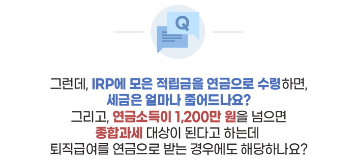 종합과세로 인해 세 부담이 늘어나는 것을 막으려면, 운용수익을 재원으로 연금을 수령하기 시작하는 해부터 해당 연금소득이 한 해 1,200만 원이 넘지 않도록 조정해야 합니다. 일부 금융회사에서는 퇴직급여가 전부 소진되는 때에 해당 사실을 IRP 가입자에게 알려서 연금수령액을 조정할 수 있도록 안내하고 있습니다.