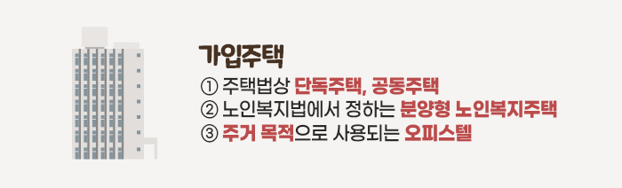 그리고 노인복지법에서 정하는 분양형 노인복지주택도 주택연금 가입 대상입니다. 복합용도주택인 경우에는 전체 건물면적에서 주택이 차지하는 면적이 절반이 넘어야 합니다. 그리고 주거 목적으로 사용되는 오피스텔을 담보로 해서 주택연금에 가입하는 것도 가능합니다.