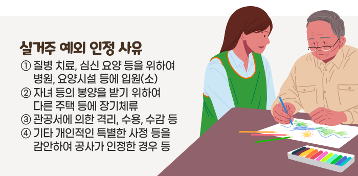 질병 치료와 심신 요양을 위해 병원이나 요양시설에 입원하거나, 자녀 봉양을 받기 위해 다른 주택에 장기간 머무는 등 불가피한 사유가 인정되면 계속 연금을 받을 수 있습니다.