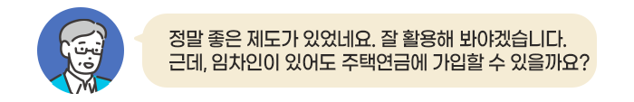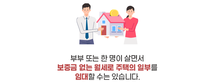 하지만 부부 또는 한 분이 살면서 보증금 없이 주택의 일부만을 월세로 주고 있는 주택이라면 주택연금에 가입할 수 있습니다. 신탁 방식의 주택연금을 이용하면 보증금이 있는 임대차가 가능한데, 이때도 보증금은 주택금융공사가 지정한 은행에 예치해야 합니다.