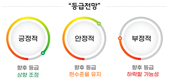 등급전망은 향후 6개월에서 2년 동안 전망을 제시한 것으로 긍정적(Positive), 안정적(Stable), 부정적(Negative)의 세 가지가 있습니다.