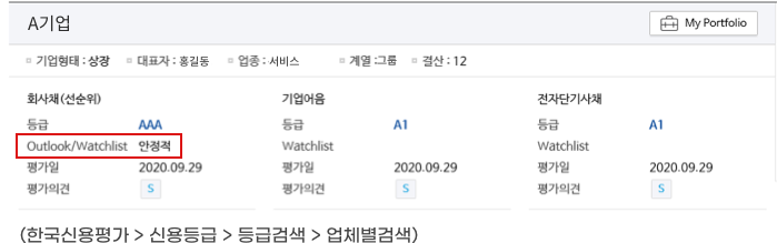 신용평가회사는 Full Report(유료서비스, 주로 연간단위 사용료 납부)와 Rating Summary(무료서비스)를 통해서 신용평가등급, 등급전망(Outlook), 등급감시(Watchlist), 등급변동요인 등을 제공하고 있습니다.