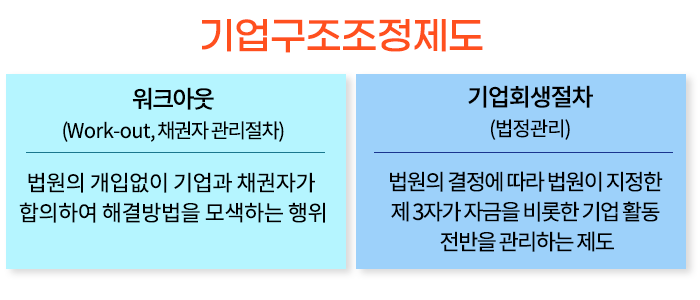 기업구조조정제도에는 부실징후기업을 법원의 개입 없이 기업과 채권자가 합의하여 해결방법을 모색하는 행위인 워크아웃(Work-out, 채권자 관리절차)과 법원의 결정에 따라 법원이 지정한 제 3자가 자금을 비롯한 기업 활동 전반을 관리하는 기업회생절차(법정관리)가 있습니다.