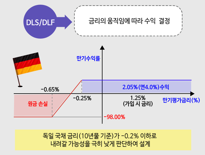 예컨대, 현재 10년물 국채 금리가 1.25%인데 6개월 후 금리가 –0.25% 아래로 떨어지지 않으면 약정된 수익인 연 4%를 얻고, -0.25% 아래로 떨어지면 원금마저 손실이 나도록 설계할 수 있습니다.