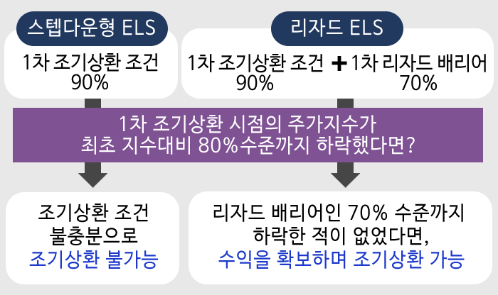 예를 들어 일반적인 스텝다운형 ELS의 1차 조기 상환 조건이 90% 라면, 리자드 ELS는 1차 조기 상환 조건 90% 이외에도 리자드 배리어 70%가 하나 더 추가되어 있는 구조입니다.