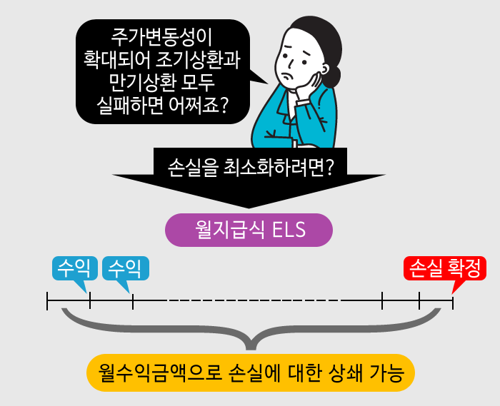 그렇다면 최악의 경우 손실을 최소화해야 하는데 이때에는 월지급식 ELS가 적합합니다.
