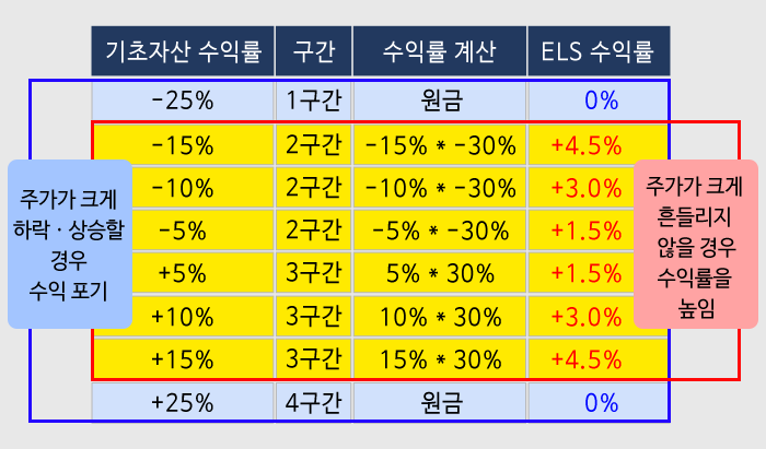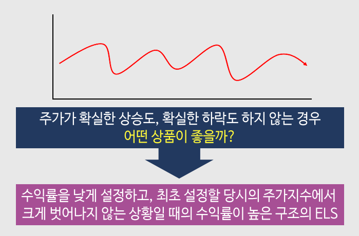 주가지수가 크게 하락하거나 크게 상승할 확률이 높지 않으니, 이때의 수익률을 낮게 설정하고, 최초 설정할 당시의 주가지수에서 크게 벗어나지 않는 상황일 때 수익률이 높은 구조의 ELS가 가장 좋은 선택이 될 것입니다.