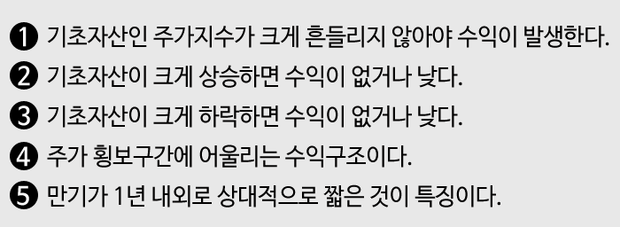 기초자산인 주가가 크게 흔들릴 확률이 적으니, 주가가 크게 하락하거나 상승할 때의 수익을 포기하는 대신, 주가가 크게 흔들리지 않았을 때의 수익률을 높이는 전략이 완성됩니다.