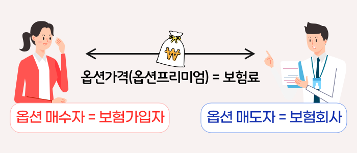 옵션 매수자는 보험 가입자, 옵션 매도자는 보험회사가 됩니다. 그리고 보험료는 옵션가격인 것입니다.