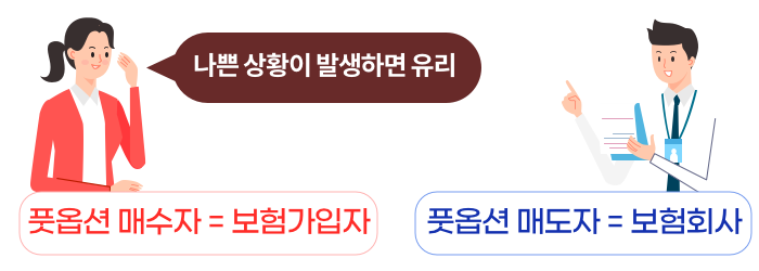 보험 가입자는 풋옵션 매수자, 보험회사는 풋옵션 매도자입니다. 풋옵션 매수자에겐 가격이 하락하거나 나쁜 상황이 발생하면 유리합니다.