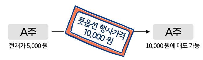 풋옵션의 행사가격이 10,000원이므로 투자자는 A 주식을 10,000원에 팔 수 있습니다. 5,000원짜리 주식을 10,000원에 팔 수 있으니 5,000원의 이익을 보는 거죠.