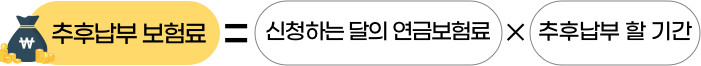 추후납부 보험료는 추후납부를 신청하는 달에 납부하는 연금보험료에 추후납부할 기간(월)을 곱해서 산정합니다.
