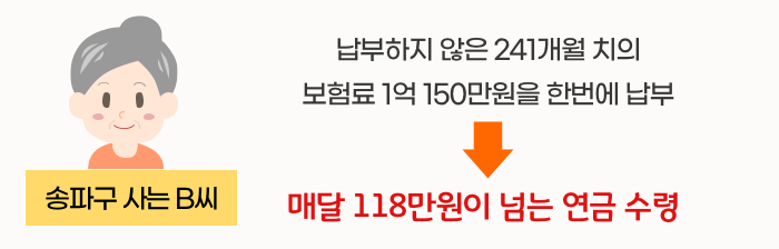 서울 송파구에 사는 B 씨(2019년 추후납부 당시 49세)는 1990년 국민연금에 가입해서 8개월 치 보험료만 납부하고 이후 241개월(20년 1개월) 치 보험료를 내지 않았다가 추후납부를 통해 1억 150만 원을 한 번에 납부했습니다.