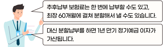 이때 내게 되는 추후보험료는 한 번에 납부할 수도 있고 최장 60개월에 걸쳐 분할납부할 수도 있습니다.(단 분할납부 시 1년 만기 정기예금 이자 가산)
