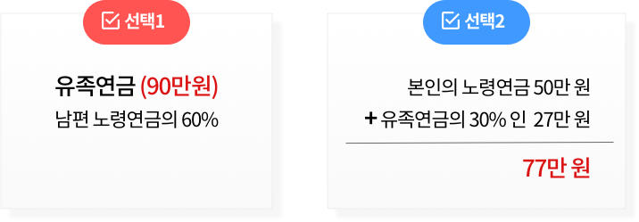 남편이 받던 노령연금의 60%에 해당하는 90만 원이 유족연금으로 나옵니다. 아내는 유족연금 90만 원을 받던가, 아니면 유족연금을 포기하고 본인 노령연금 50만 원에 유족연금의 30%에 해당하는 27만 원을 더해 77만 원을 받을 수 있습니다. 당연히 유족연금 90만 원을 선택하는 게 좋겠죠.