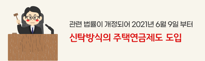 이 같은 문제를 해결하기 위해 관련 법률이 개정되어 2021년 6월 9일부터는 신탁방식의 주택연금제도를 도입하기로 했습니다. 이렇게 되면 주택소유자가 먼저 사망하더라도 연금수급권을 남은 배우자에게 자동으로 승계할 수 있습니다.