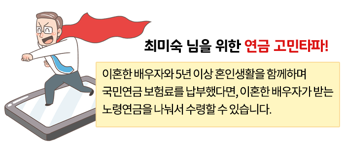 예를 들어 최미숙 님과 이혼한 배우자가 30년간 국민연금에 가입해서 매달 노령연금으로 150만 원을 수령하고 있다고 해보겠습니다.