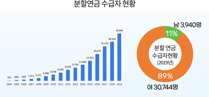 분할연금이란 이혼한 자가 배우자였던 자의 노령연금 중 혼인 기간에 해당하는 연금을 나누어 지급받는 것인데, 황혼이혼이 늘어나면서 분할연금 청구 건수도 빠르게 늘어나고 있습니다. 국민연금공단에 따르면, 2004년 연말만 하더라도 342명에 불과했던 분할연금 수급자가 2019년 연말에는 34,684명으로 늘어났다고 합니다.
