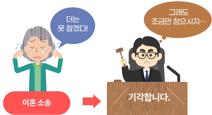 그런데 법원이 오랜 결혼생활과 노령이라는 점을 이유로 들어 할머니의 이혼청구를 기각했습니다.지금까지 함께 살았으니 앞으로의 남은 생도 배우자와 함께 살라는 것이지요.