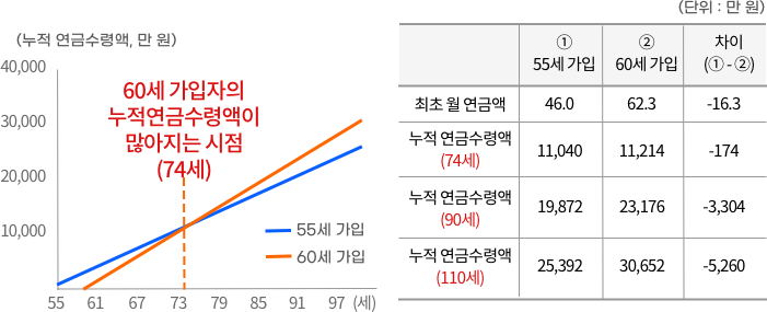 55세에 가입하는 것과 비교해 보면, 60세에 가입한 가입자가